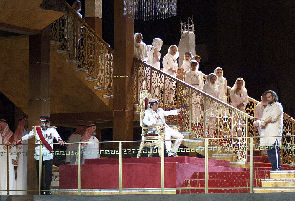 Con il previsto scandalo da parte del «pubblico elegante e sofisticato della prima» e di certa critica miope e prevenuta, dell’intervento della polizia a sedare i tafferugli causati dal pubblico elegante e sofisticato e dell’interrogazione parlamentare di un senatore del PdL (che ovviamente neanche ha visto lo spettacolo), Graham Vick e lo scenografo Stuart Nunn ambientano la vicenda mediorientale ai giorni nostri. La scena è devastata dalla guerra e piena di detriti, nel bel mezzo un palazzo reale dalla sontuosità kitsch sembra aver subito un bombardamento e sul fondo un muro (in cui si aprirà una breccia per far fuggire gli ebrei) simile alla “barriera di separazione” eretta dagli israeliani lungo la West Bank.