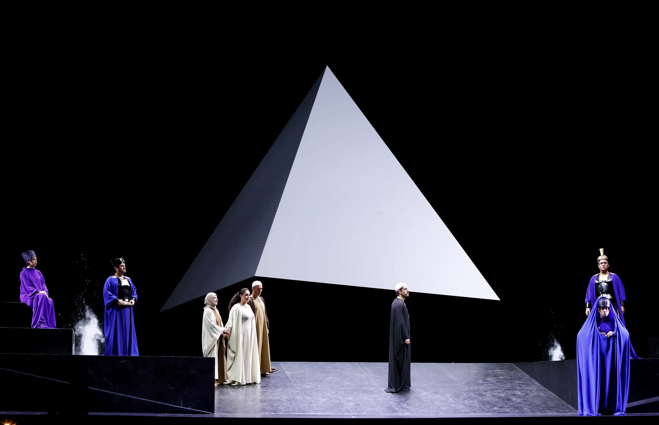 Nella estetizzante sequenza di tableaux vivants offerti alla vista manca però il dramma: i personaggi, così come sono rappresentati, rimangono esangui e bidimensionali, le ambiguità dei rapporti sono neglette, le tensioni tra le etnie latitanti. Dei finali solo l’ultimo smuove un po’ l’emozione del pubblico con quelle silhouettes nere sul fondo bianco di un nulla inquietante. Ma fa pensare il silenzio glaciale che aveva accolto la preghiera di poco prima, «Des cieux où tu résides», versione in francese di «Dal tuo stellato soglio»: pubblico soggiogato dall’emozione o non toccato dal pathos del momento. Vorrei pensare alla prima ipotesi.
