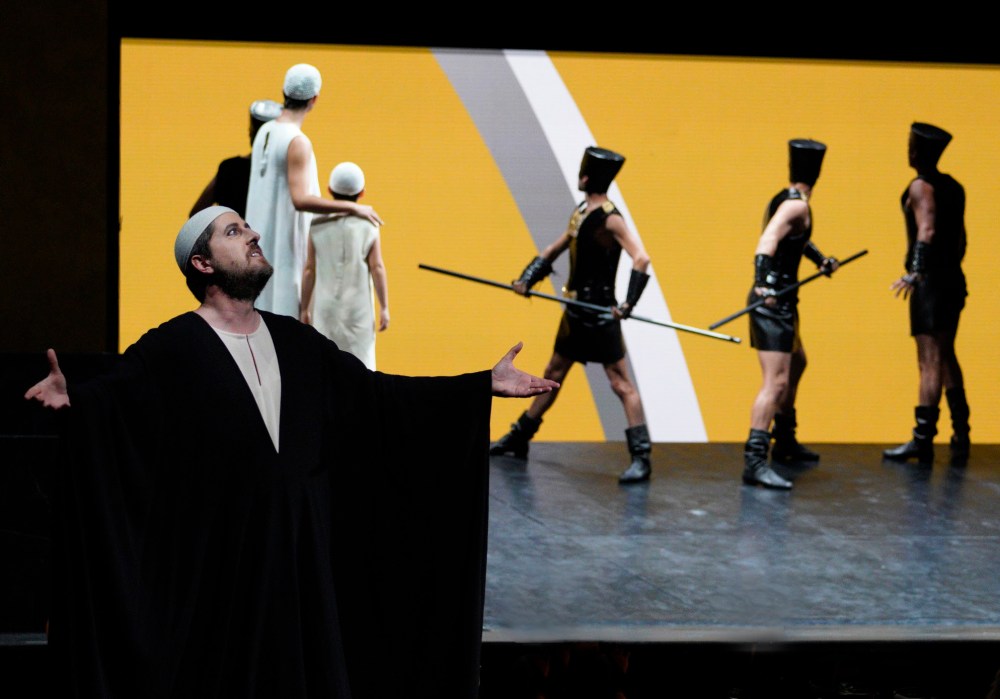 Com’era da aspettarsi è la direzione di Michele Mariotti il punto forte dello spettacolo. La cura per ogni dettaglio della partitura non inficia la visione d’insieme di un’opera che di per sé ha una certa frammentarietà. L’orchestra dell’opera di Lione risponde con precisione e gusto del colore alla bacchetta di Mariotti che concerta da par suo le voci nei tanti ensemble di un’opera povera di arie solistiche. Nel reparto femminile Jeanine de Bique è una sensibile Anaï mentre Vasilisa Beržanskaia nella parte di Sinaïde conferma le eccezionali doti rivelate un anno fa a Pesaro e Géraldine Chauvet è una empatica Marie. L’inossidabile Michele Pertusi fa del suo Moïse una figura memorabile utilizzando gli inevitabili segni dell’età del suo mezzo vocale per delineare con espressività il personaggio e Mert Süngü si cala con agio nella parte di Eliézer. Adrian Sâmpetrean è un autorevole ma tormentato Pharaon mentre in Aménophis, alla prima di Parigi Adolphe Nourrit, Pene Pati mostra qualche diffcicoltà in un ruolo di grande impegno vocale. La voce misteriosa e quella di Osiride appartengono al bel timbro di Edwin Crossley-Mercer. Alessandro Luciano è il truce Aufide. È anche dell’opera di Lione il coro efficacemente impegnato in pagine che prefigurano il Nabucco verdiano.