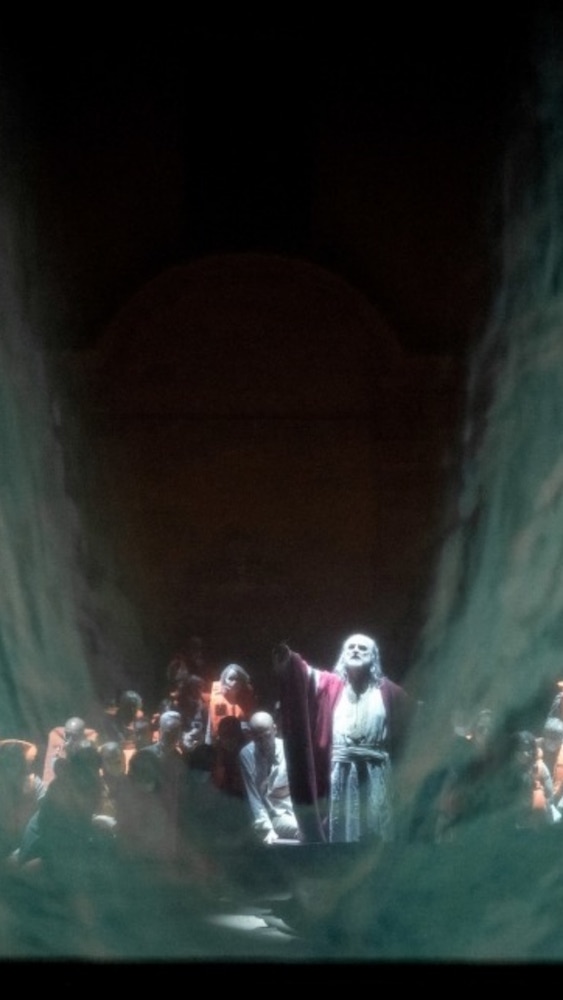 Dove Pizzi si adegua invece alla modernità è negli effetti teatrali e scenografici previsti dal Moïse et pharaon. Sul programma di sala M. Elizabeth C. Bartlet ci informa con grande dettaglio sulle circostanze della prima parigina del 26 marzo 1827, una produzione che allora fu definita «epocale, rivoluzionaria», come scrissero enfaticamente le cronache del tempo, una sfida alla credibilità dell’opera del vecchio regime e alle limitazioni del mezzo teatrale. Uno spettacolo, insomma, che preludeva al genere grand opéra degli anni 1830-50. Alle opulenti scenografie e ai diorami dipinti di Pierre-Luc-Charles Cicéri si aggiungevano grandiosi effetti speciali e un’innovativa luministica per rappresentare l’arbusto che prende fuoco, l’arcobaleno, l’oscurità e il ritorno della luce, la pioggia di fuoco, le acque del mare che si aprono e si richiudono… Oggi Pizzi ha a disposizione la video grafica, che risolve facilmente i problemi posti allora dalle macchine, dalle funi, dalle candele e dai dipinti trompe-l’œil. Ecco quindi sul fondo un gigantesco schermo su cui vengono proiettate immagini in movimento – anche qui la locandina non cita gli autori – efficaci, ma niente più. Sia che si tratti dell’arcobaleno (qui un arco tridimensionale), di bolidi infuocati che cadono sulla terra, dell’eclisse solare e della conseguente oscurità, di una piramide volteggiante nell’aria che poi si disgrega, delle acque prima calme che si ritirano al passaggio degli ebrei e poi si richiudono tempestose sugli egizi.