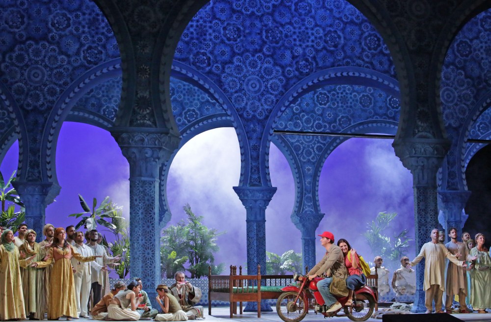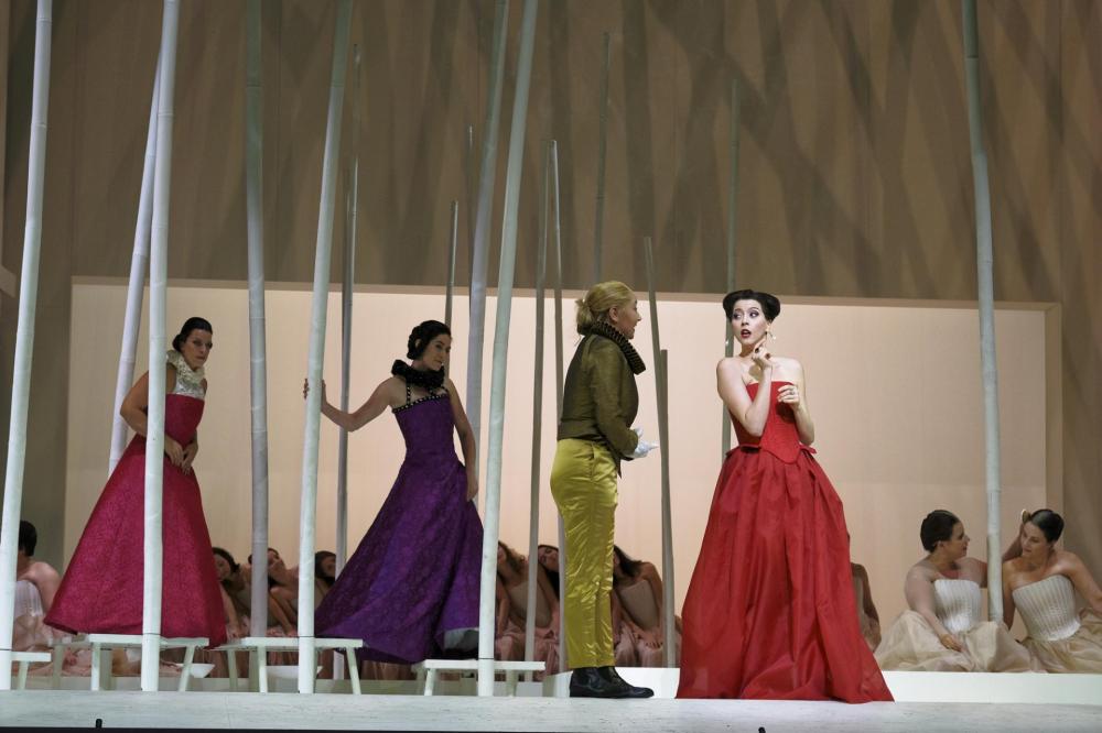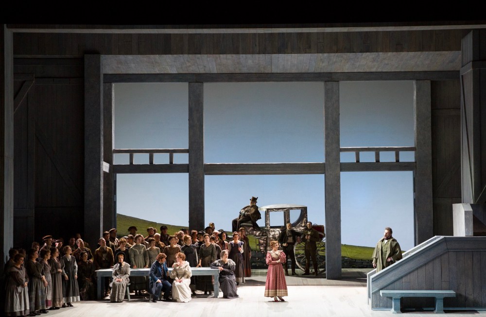 E lugubremente grandiosa è la messa in scena di David Pountney nata alla Welsh National Opera e ripresa qui a Zurigo. Potrebbe essere adatta per il palcoscenico galleggiante di Bregenz: un’enorme mano scende dall’altro e tira i fili di un umano ridotto a marionetta durante l’ouverture e manichini in maschera si mescolano al coro su piattaforme semoventi sul fondo di un sipario nero dalle rigide pieghe disegnato, come il resto della scenografia, da Raimund Bauer. Alcune idee non sono al 100% originali: già David Alden nel 1989 al Coliseum aveva messo delle ali nere a un Oscar angelo della morte e la presenza di uno scheletro era il punto di forza della scenografia nello spettacolo di Richard Jones alla Seebühne nel 1999.