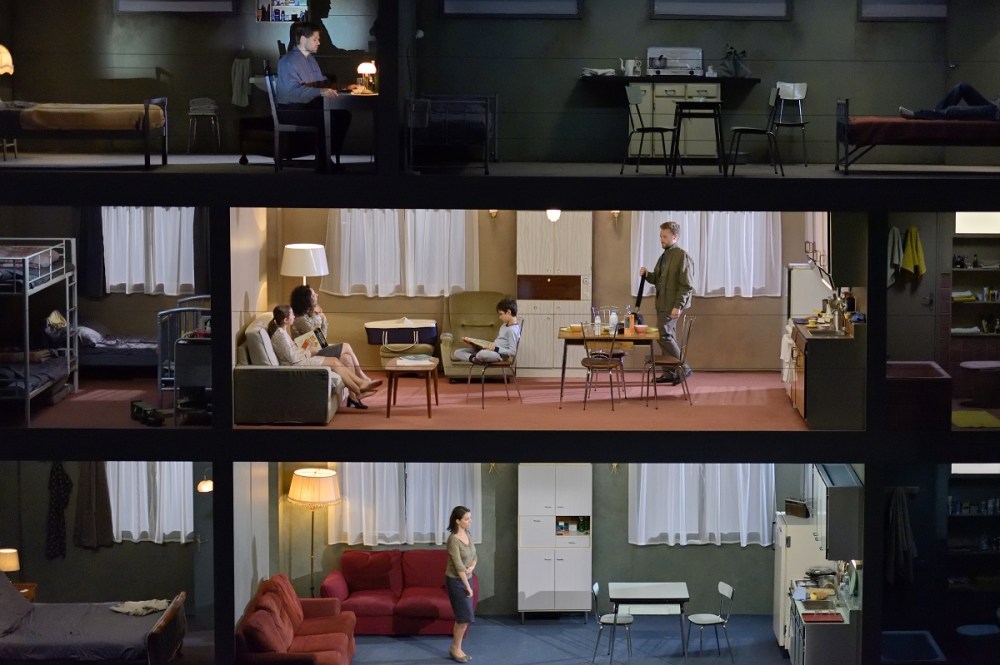 Nella sua regia l’inverno è uno dei personaggi principali: i video che vengono proiettati si legano con continuità con quanto vediamo in scena e mostrano la Russia di oggi nella morsa del freddo, e della polizia. Minacciosi veicoli sgomberano mucchi di neve sporca mentre la polizia sistema con movenze coreografiche griglie di sbarramento e agita i manganelli. In mezzo barcollano Babbi Natale ubriachi e manifestanti sparsi. Se Il naso di Barrie Kosky era l’epitome del grottesco, qui il tema dominante è il gelo, metafora della democrazia congelata: nella stazione di polizia che entra in scena su ruote i poliziotti arrestano gli oppositori e tagliano loro il naso e dalla Neva ghiacciata vengono pescati pezzi di cadaveri. Anche molta parte della popolazione indossa le uniformi della polizia, è una massa disinformata, disillusa, incitata contro i dissidenti. Ma attenzione: il termine Polizei in tedesco sulle divise non è traslitterato in cirillico. Non è che anche qui “all’ovest” dobbiamo stare attenti a difendere la nostra democrazia, sembra suggerire il regista russo.