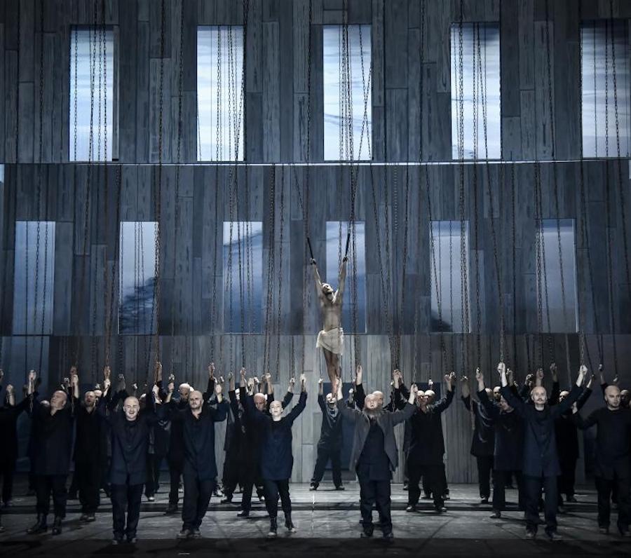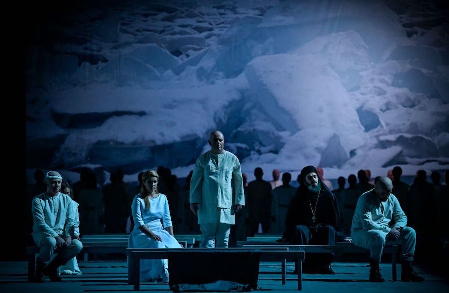 La presente produzione salisburghese de L’idiota è quella che potrebbe confermare il nome di Weinberg nella trilogia dei russi della seconda metà del Novecento, assieme a Prokof’ev e Šostakovič cioè. Lo fanno prevedere la qualità dello spettacolo affidato per la parte visiva a un altro polacco, Krzysztof Warlikowski che ambienta la vicenda nella Russia del passato presente. La scenografia della moglie Małgorzata Szczęśniak copre le arcate della Felsenreitschule con una lunghissima parete di legno in cui si inserisce uno schermo per la proiezione dei video di Kamil Polak e un ambiente aggettante chiuso, per le scene più intime. Pochi altri elementi occupano lo spazio immenso del palcoscenico che permette la compresenza di scene diverse. Concepito prima dell’invasione dell’Ucraina, lo spettacolo ha assunto un ulteriore significato, come scrive il regista: «Dostoevskij è una figura pericolosa. Non ha mai nascosto il suo lato antisemita, razzista, nazionalista, panslavo e, alla fine della sua vita, zarista. È la grande mente dietro l’immagine della Russia eterna, forte, dominante e oscura. Oscura e in conflitto con i valori dell’Europa occidentale. Sorprendenti sono le analogie con quanto sta accadendo dal 24 febbraio 2022, o più precisamente dall’occupazione di parte del Donbass e della Crimea nel 2014. Se il genio di Dostoevskij non fosse stato al servizio del nazionalismo, forse i russi non sarebbero diventati gli autori di tutto ciò che hanno commesso nel corso del XX secolo e di ciò che vediamo oggi in Ucraina».
