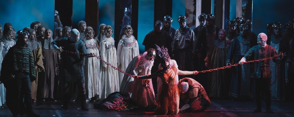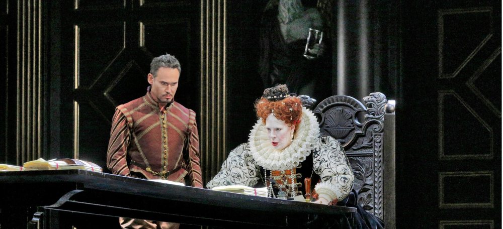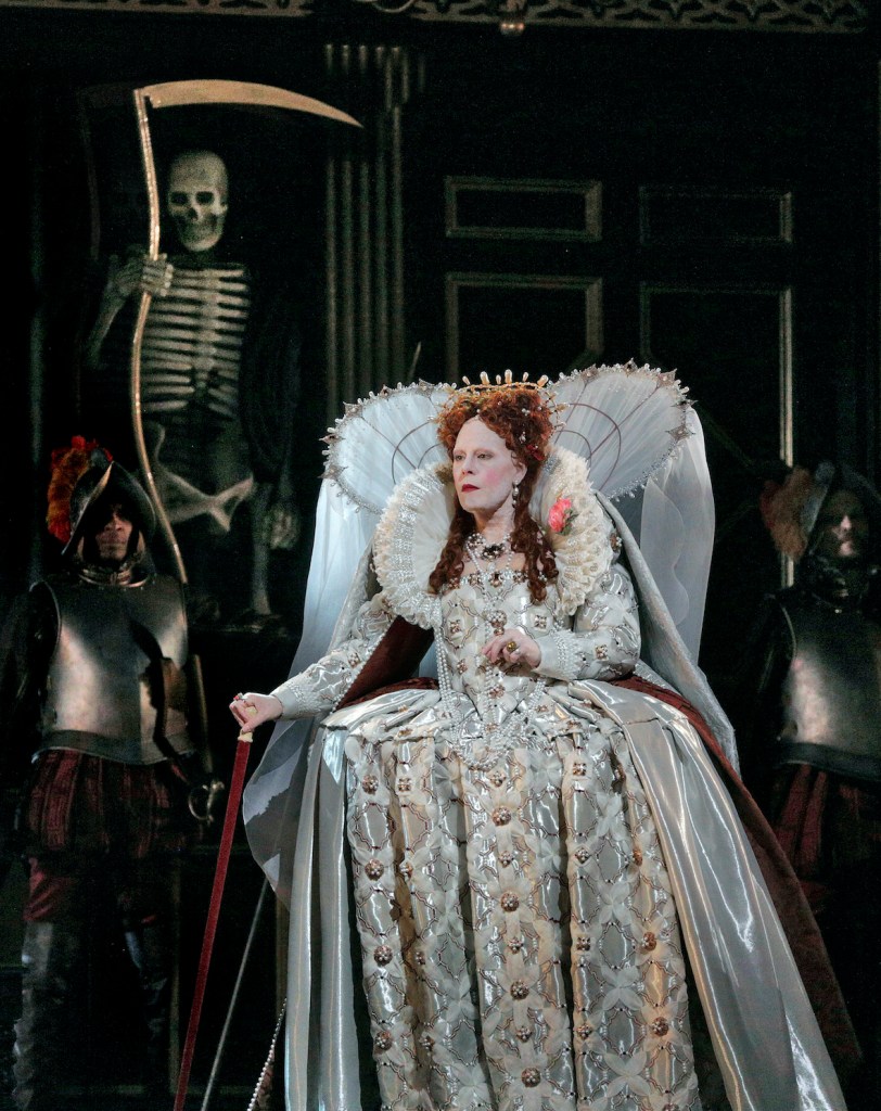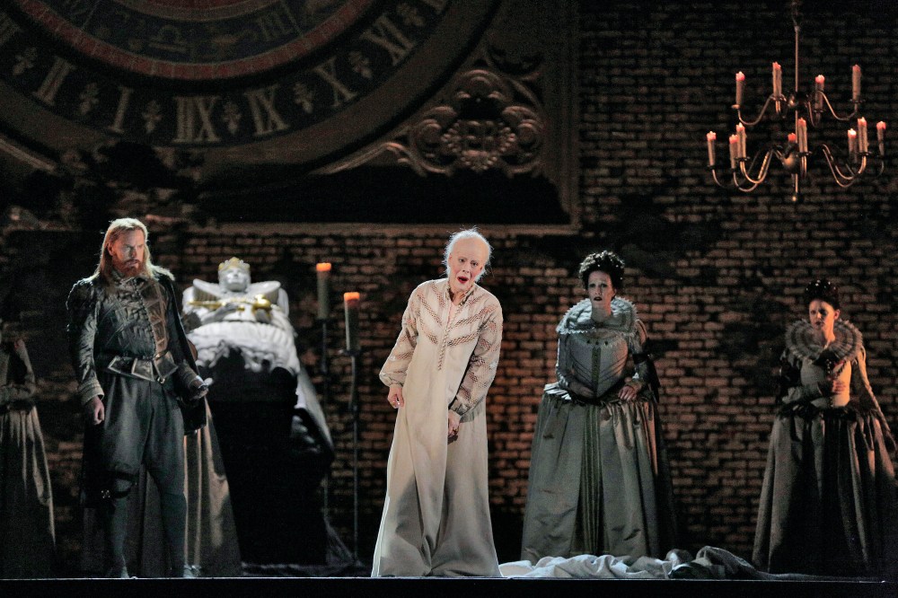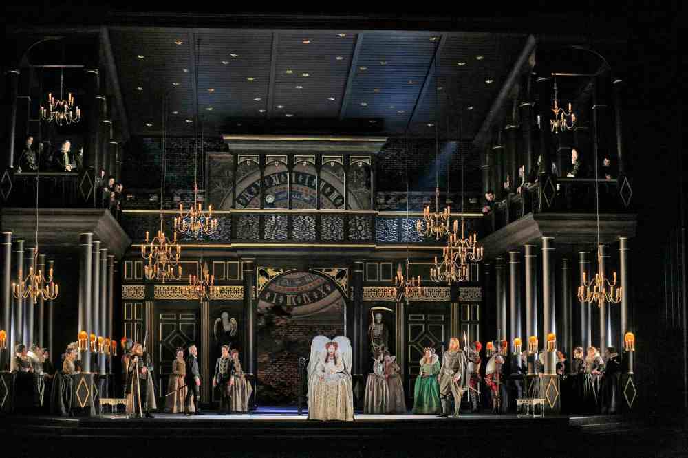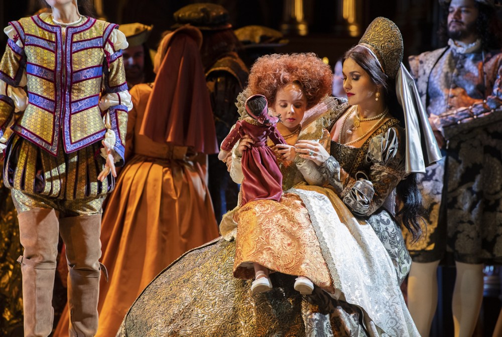 Visivamente lo spettacolo del duo Mariame Clément (regia) e Julia Hansen (scenografia) è piacevole e non intralcia il flusso sonoro, ma da un team al femminile come questo mi sarei aspettato una presa di posizione più decisa contro il maschilismo di un monarca che non si ferma davanti a nulla per affermare il suo potere e soddisfare le sue voglie. In scena vediamo un a storia lineare con costumi ragionevolmente d’epoca (pochi i tocchi di modernità) e un ambiente elegante formato da un interno con pareti con un’alta pannellatura. Una struttura quasi cubica ruota giocando con efficaci rapporti di interno-esterno. Mentre la presenza di un’Elisabetta bambina è quanto meno scontata, quella di un’Elisabetta diventata regina e vecchia venuta dal futuro per rivivere il trauma della sua famiglia è meno prevedibile ma comunque non fastidiosa. Stranamente qui nella regia della Clément la bambina Elisabetta a momenti sembra preferire l’affetto della Seymour a quello della madre e questo magari potrebbe mettere in luce qualche particolare psicanalitico che forse un altro regista vorrà sviluppare.