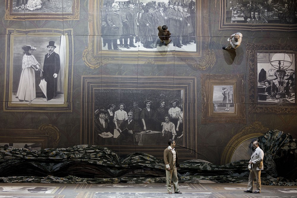Durante la lettura della lettera fatta da una voce maschile fuori scena, Google Earth ci porta nella villa dei coniugi: scendiamo dall’alto, la costruzione assume tridimensionalità, ruota su sé stessa ed entriamo dalla finestra. Qui la camera, spoglia ma col camino acceso, ha una spessa cornice ed è come sospesa nell’immenso palcoscenico dell’Opéra Bastille. Tutta la vicenda si alternerà tra questa stanza e la piazza.