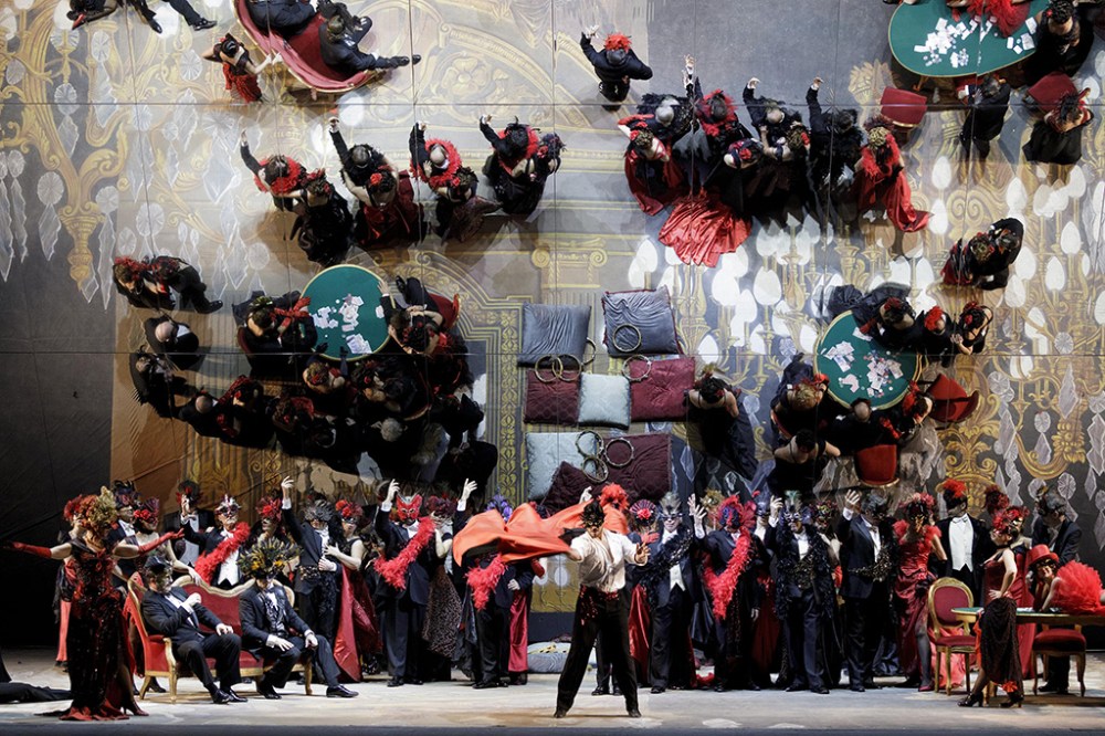 Nelle scene di massa lo specchio fa sembrare un formicaio visto dall’alto gli invitati e mostra particolari che non sarebbero visibili solo frontalmente. La scena di apertura si svela così in tutta la sua vera licenziosità con donnine in guépière appartate con uomini in maniche di camicia. Inutili e banali i movimenti coreografici di Valentina Escobar, compresa una incongrua ballerina in tutu. Difficile è poi trovare una soluzione che renda accettabile la scena delle zingarelle e dei toreadori. Neanche qui si è trovata.