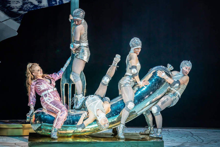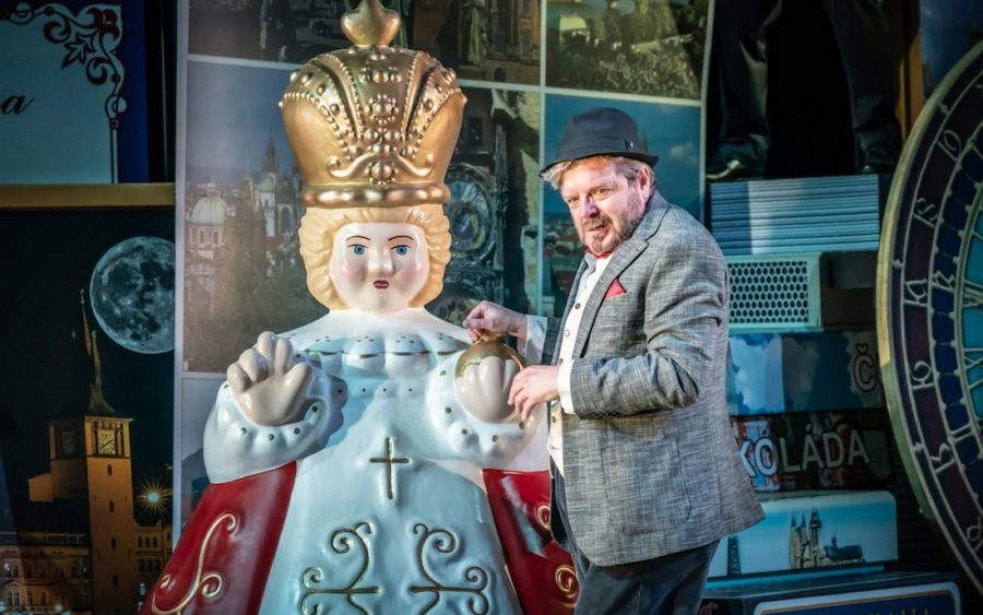 Questa è la seconda volta che Pountney mette in scena I viaggi di Janáček, la prima fu nel 1992 all’English National Opera e vi si alludeva alla Rivoluzione di velluto che tre anni prima condusse alla dissoluzione dello Stato comunista cecoslovacco. Questa è una produzione totalmente differente con un tocco di Monty Python: la scenografia di Leslie Travers ambienta la vicenda tra un bric-à-brac di souvenir della città d’oro in formato gigante sotto un piatto spezzato decorato con la vista di Hradčany, l’antico palazzo reale alto sulla collina. La birra è una presenza costante, Pegaso è una lattina di Pilsner e i pezzi grossi della Praga del XV secolo vengono portati in giro come statue del Ponte Carlo su carrelli costruiti con casse di birra. I lunatici sono artisti fatui e travestiti dai nomi di Postdatedček o Spotček e negli irriverenti costumi in lattice scintillante di Marie-Jean Lecca. La vicenda del 1420 è preceduta da una scena opportunamente contrassegnata “1989”, in cui l’Autore diventa un imprigionato Vaclav Havel – il poeta dissidente e perseguitato politico sotto il regime comunista dell’allora Cecoslovacchia – alla ricerca di parole «ferventi e liriche, non solo satiriche, come tutto questo».
