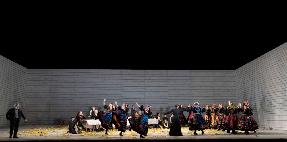 L’asciuttezza è la caratteristica vincente di questo allestimento che lavora per sottrazione pur senza piegare la drammaturgia a significati estranei. Pochi i colori e solo nei bei costumi di Markéta Oslzlá-Sládečková che danno il giusto tocco folklorico alla vicenda e sono utilizzati in senso espressivo: il rosso di Karolka, Števa, del sindaco e della moglie; il nero di Jenůfa, Laca, della nonna e della Kostelnička; il bianco delle ragazze incinte nel primo atto e delle damigelle nell’ultimo. I ruoli sociali sono così chiaramente denotati.