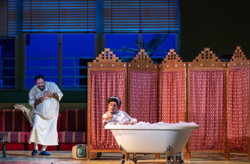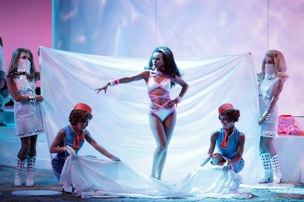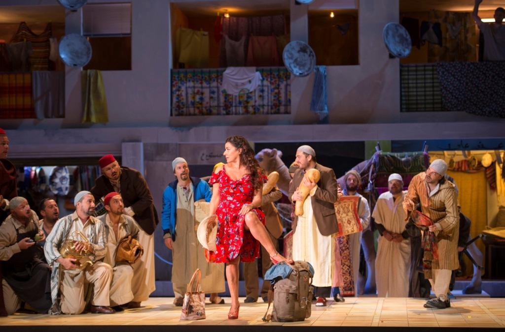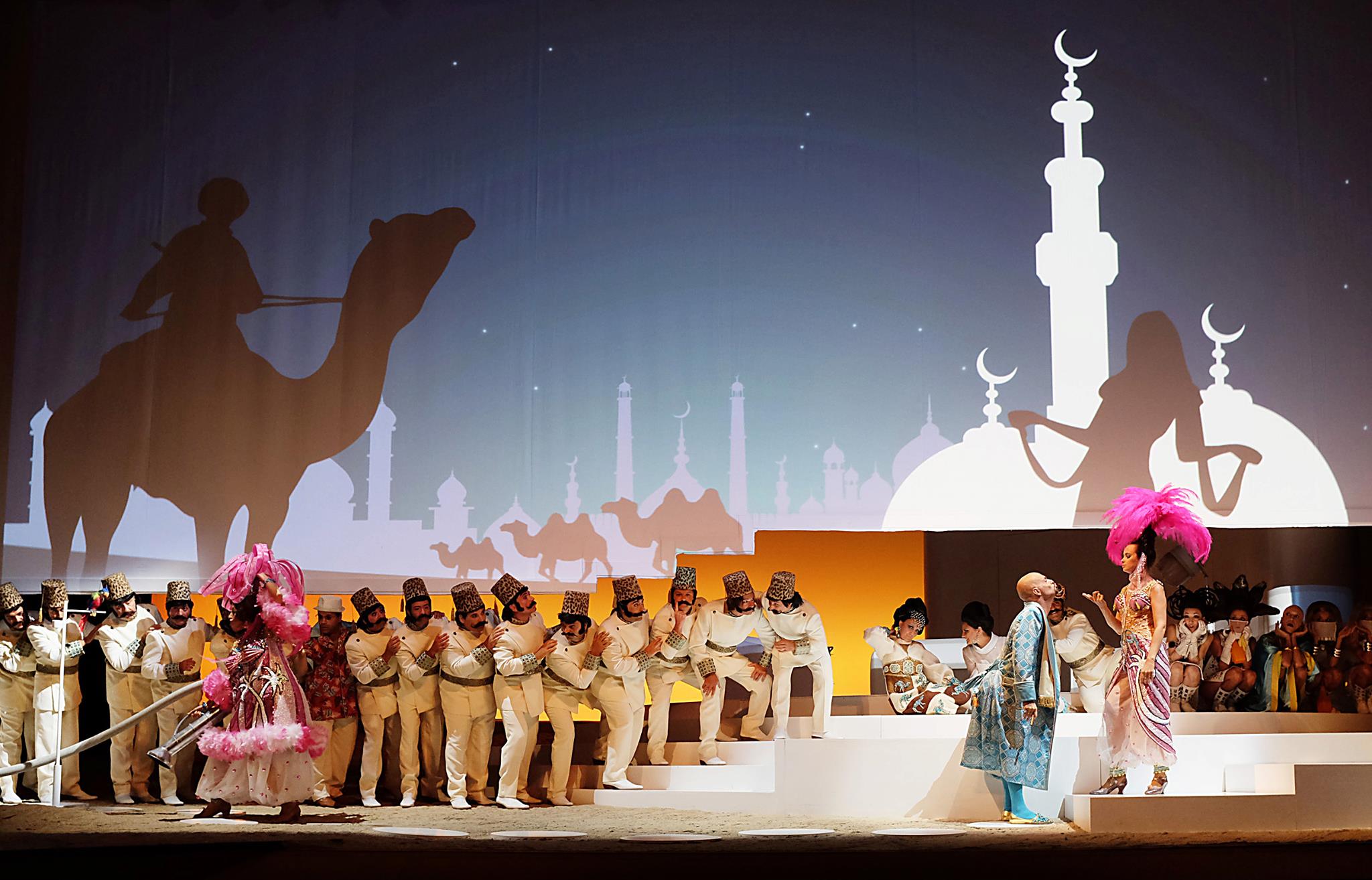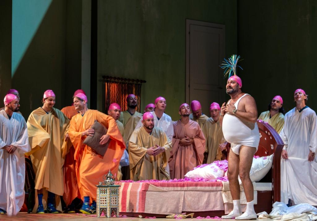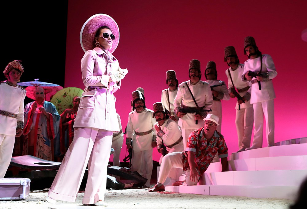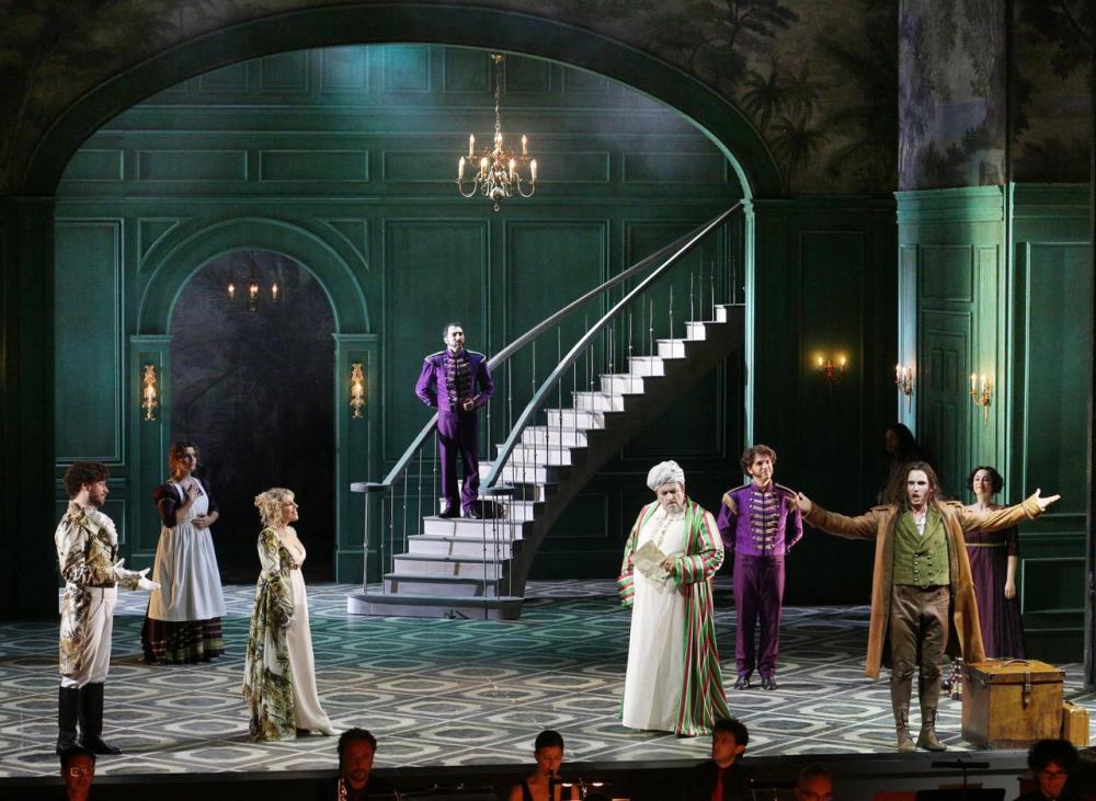 Musica che si rivela sorprendente per bellezza e originalità: a momenti viene il sospetto che il Maestro Corrado Rovaris, che dirige l’Orchestra Donizetti Opera, si sia divertito a inserire pagine estranee, ma il fatto è che alcuni momenti richiamano un Rossini a venire – c’è infatti l’inno che troveremo nel Viaggio a Reims! – tanto è felice l’invenzione tematica e strumentale della partitura messa sapientemente in risalto dalla sua concertazione. Gli scatti ritmici delle marcette (alcune suonate da una grande banda in scena), i solenni toni degli inni, lo slancio delle cavatine, i colori degli strumenti, le gemme melodiche, la raffinata armonizzazione, tutto è reso con mano felice e l’equilibrio tra buca e voci sul palco viene mirabilmente realizzato. (1)
