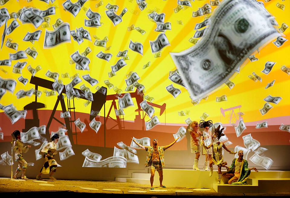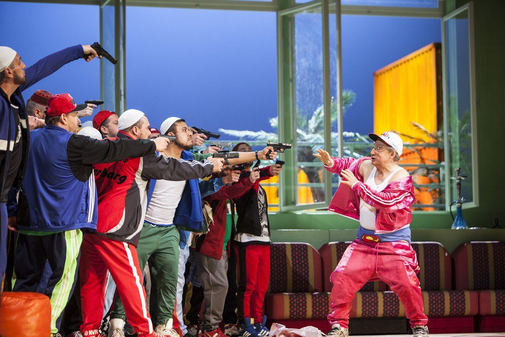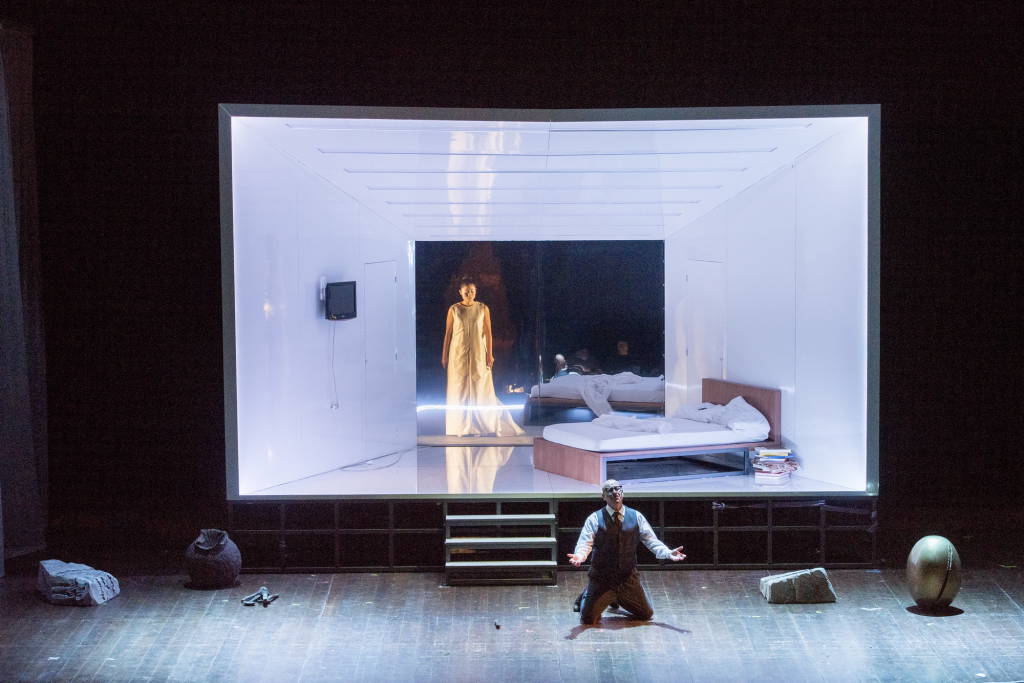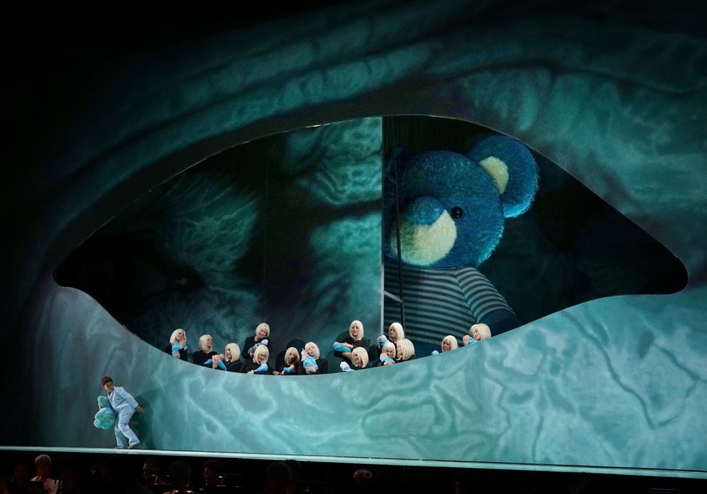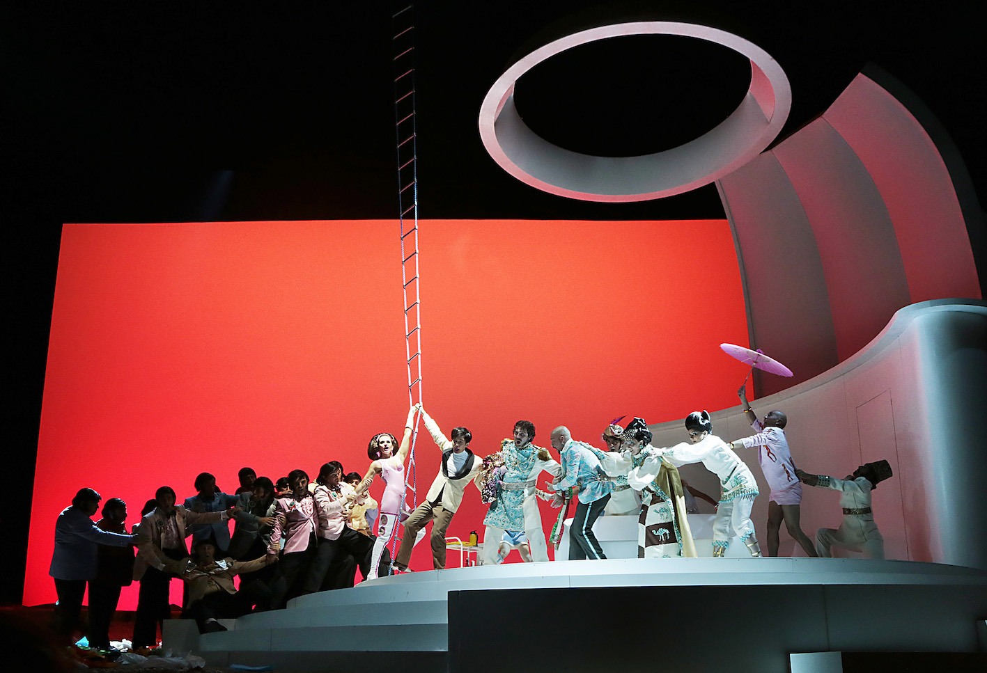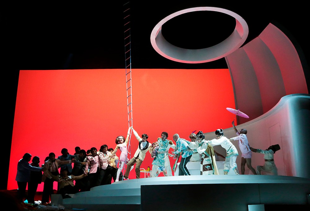Nella regia di Pintor i personaggi/interpreti si muovono con efficacia all’interno di una semplice struttura scenografica. Anche qui sullo stesso led wall de Il diluvio universale appaiono immagini reali, quali incendi, distruzioni e l’assalto a Capitol Hill (con il copricapo cornuto dello shamano che troveremo sulle teste dei danesi!), alternate a una grafica ironica ed elegante che utilizza i codici e le miniature dell’epoca. Ma la presenza delle immagini qui è molto meno invasiva e non distrae dalla musica come era invece successo nel Diluvio.