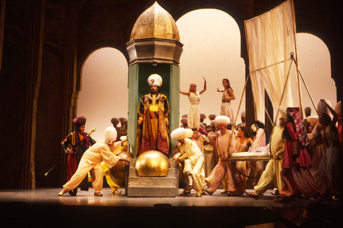 Mandandolo in scena per la prima volta in epoca moderna, il Festival di Bergamo offre a questo lavoro una prova d’appello e diciamo subito che il pubblico ha apprezzato sia la parte musicale sia quella visiva dello spettacolo, affidato a un non conosciutissimo Stefano Simone Pintor che ha saputo dare una lettura convincente a un’opera che rivela non pochi buchi drammaturgici. Proprio partendo da questo evidente difetto, Pintor ha ideato una messa scena che parte inizialmente da una esecuzione da concerto con gli spartiti in mano ai cantanti e al coro, per inserire a mano a mano i costumi dell’epoca, disegnati da Giada Masi. E allora le copertine in mano ai coristi diventano degli scudi con la croce rossa su fondo bianco. Partendo dalla figura del sovrano che promosse l’alfabetizzazione dei suoi sudditi, ecco i libri che piovono dall’altro nel video o sono sparsi in scena: la cultura contro la barbara violenza, la lettura contro il rogo delle biblioteche.