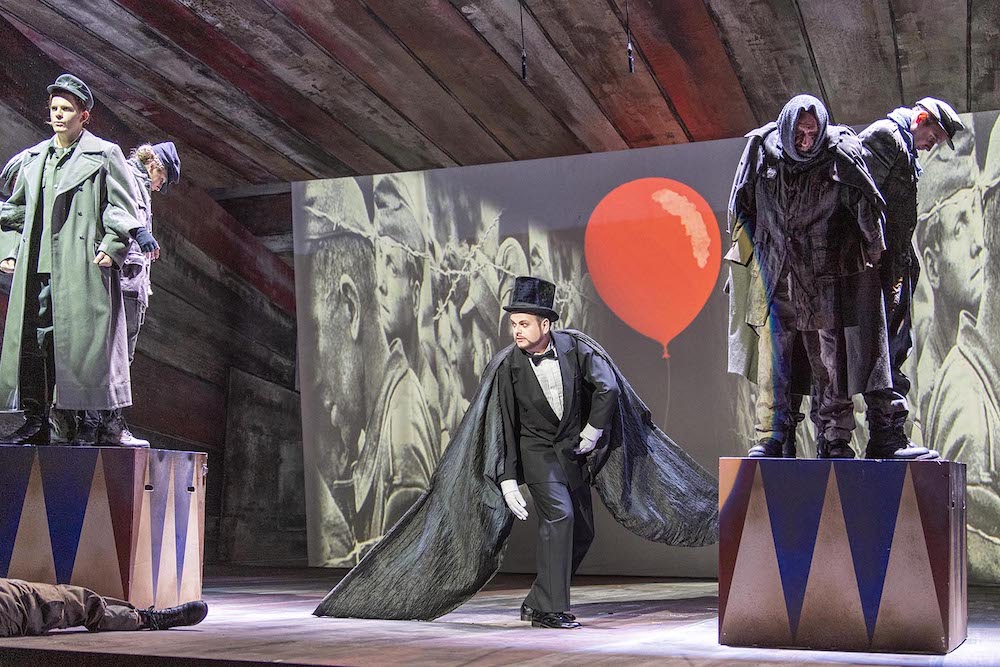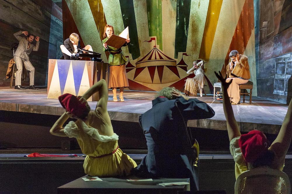 L’ultima produzione di Leonore 40/45 risale al 1959 a Oldenburg e allora il pubblico sembrò non approvare il dramma della fraternizzazione tra un soldato della Wehrmacht e una giovane francese: «L’opera aveva provocato rivolte tra il pubblico in tutte (!) le sue rappresentazioni in Germania. Piuttosto che una riconciliazione tra “nemici ereditari”, la vedevano solo come una spregevole collaborazione» scrive Ulrich Schreiber (Advanced opera guide, the history of music theatre). Sessant’anni dopo molte cose sono cambiate e questa nuova produzione non incontra pregiudizi del genere. Leonore 40/45 fa parte del progetto “Focus” dello Stadttheater – che non è nuovo a prime mondiali di grande interesse – ed era stata originariamente programmata assieme al Fidelio a celebrazione del 250° anniversario del compositore di Bonn, ma si era messo di mezzo il Covid e l’opera va ora in scena senza il pendant beethoveniano. La regia di Jürgen R. Weber fa svolgere la vicenda come in un cabaret con un angelo narratore che appare all’inizio come il Canio di Pagliacci a introdurre la vicenda agli spettatori. La scenografia di Hank Irwin Kittel non usa la piattaforma rotante ormai imprescindibile negli allestimenti di oggi, ma costruisce una stanza-scatola con il piano in pendenza. L’azione avviene anche al di fuori mentre sullo sfondo uno schermo ospita filmati d’epoca e un altro schermo in una cornice barocca i video in stile Monty Python della visual artist Gretchen fan Weber. Il regista inserisce con le sue immagini il dramma che manca alla musica, come quando mostra il taglio dei capelli e la svastica dipinta sulla schiena alla ragazza, la punizione per le donne che erano state considerate collaborazioniste.