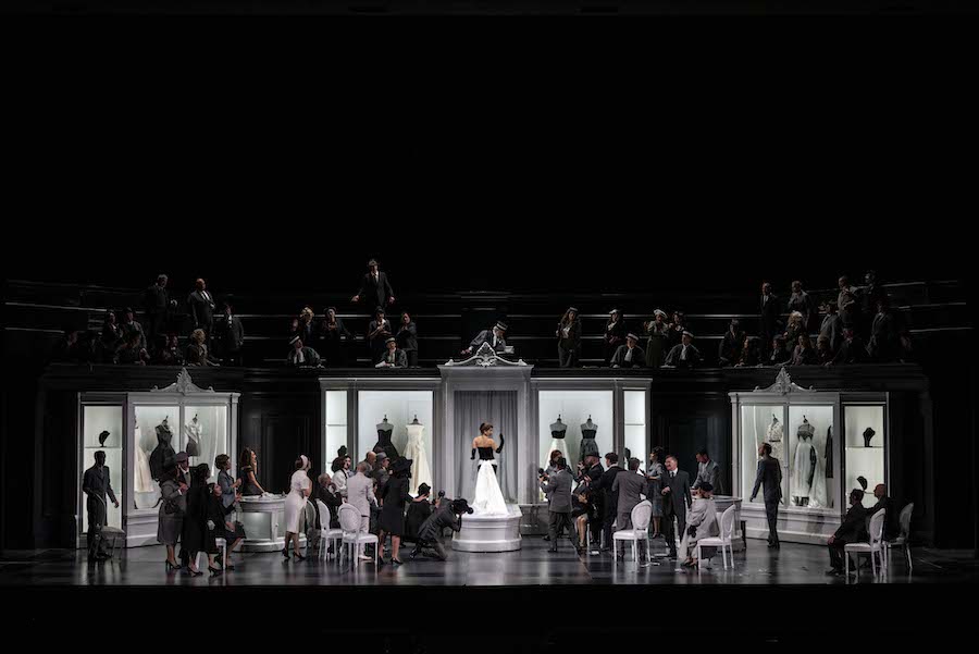 Nella lettura di Kosky i dialoghi, spregiudicatamente riscritti, hanno molte allusioni all’attualità politica della Francia. La scenografia fissa di Rufus Didwiszus, un salone grigio sbiadito con modanature Secondo Impero, è arricchita da 11 tele dipinte con paesaggi. Nel secondo atto l’arrivo della principessa di Granada e della sua corte dà luogo a uno spettacolare tableau vivant grondante d’oro. Con i costumi di Victoria Behr, Kosky mette in campo tutti i mezzi dell’Opéra di Parigi per allestire un corteo degno di una produzione particolarmente sontuosa, ad esempio del Don Carlos, in cui i membri della corte spagnola avanzano come in una processione della Semana Santa. La principessa è alla testa del corteo, in un abito ampio e rigido ispirato all’Infanta Maria Teresa di Vienna ritratta da Velazquez, mentre le sue dame di compagnia hanno tutte costumi di alta moda disegnati individualmente. Gli uomini arrivano su cavalli da tiro a rotelle in farsetti, gorgiere e pantaloni d’oro. Le ballerine indossano i trajes de luces ricamati in oro dei toreador e tutti hanno i capelli di un vivace colore arancione. In fondo un Cristo in grande scala, quasi nudo e palestrato, ondeggia lentamente affiancato da due vergini dei dolori in nero, su piedistalli d’oro, una circondata da candele, l’altra da gigli. Se tra il pubblico si era alzato qualche sopracciglio al primo atto, questo quadro mette tutti d’accordo per la teatrale e ironica opulenza degna del miglior Kosky.