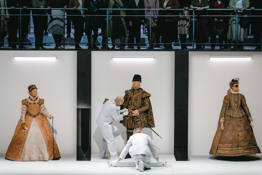 Che poi un’opera come il Don Carlo di Verdi abbia bisogno di una interpretazione complessa che aggiunge ulteriori livelli a quelli già presenti è da discutere, ma la forza teatrale e la coerenza della lettura di Serebrennikov sono fuori questione. «Verdi non rende facile la vita del regista», scrive Serebrennikov, «È difficile mettere in scena le sue opere in modo razionale e c’è il serio rischio di trovarsi in un vicolo cieco concettuale. Un capolavoro così compatto e dalla struttura accattivante come il Don Carlo parla quasi da solo, resistendo a tutta una serie di tecniche di produzione moderne. Come regista, quindi, mi sono trovato ad affrontare una grande sfida. La seguente considerazione è diventata la chiave del mio concetto: Schiller stesso una volta ha descritto l’opera come “un ritratto di famiglia in una casa principesca”. Questo significa che dobbiamo guardare all’ambientazione storica e sociale della sua storia e dei suoi personaggi. Ma ho dovuto trovare il mio accesso artistico a tutto questo perché l’opera fosse un vero teatro e non un “concerto in costume”, come descriviamo gli spettacoli d’opera con una messa in scena statica e la mancanza di interpretazione drammatica e questo significava che dovevo drammatizzare i costumi stessi e abbiamo deciso di ricostruire i costumi degli attori storici con un elaborato processo. I costumi ufficiali degli originali storici dei personaggi dell’opera […] sono documentati in una serie di ritratti a figura intera del XVI secolo, questi ritratti e le loro rappresentazioni sono soprattutto rappresentazioni di potere».