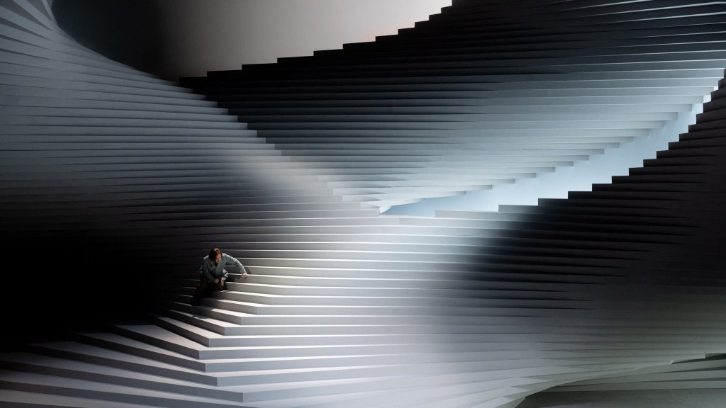 Un anelito assoluto alla libertà sembra essere la lettura che ne dà il regista Christoph Waltz, attore austriaco due volte premio Oscar ora alla sua seconda regia lirica. Depurata di ogni elemento che ricordi l’epoca e il luogo – i costumi di Judith Holste suggeriscono una moderna una società militarizzata – la vicenda di questa pièce à sauvetage si svolge lungo una scenografica monumentale scala, disegnata dallo studio di architettura Barkow Leibinger, che sale a spirale verso un’apertura in alto impossibile da raggiungere, un mondo da cui non si può fuggire. Dal punto di vista visivo l’assenza di colori è totale, sono presenti solo varie sfumature di grigio-verde e grigio-azzurro. Sembra così di fare un salto nel tempo, alle scenografie minimaliste di Wieland Wagner nella Bayreuth degli anni ’50-’60, ma l’astrattezza e simbolicità dell’ambientazione contrasta con il realismo della recitazione dei cantanti-attori nei lunghi dialoghi parlati.