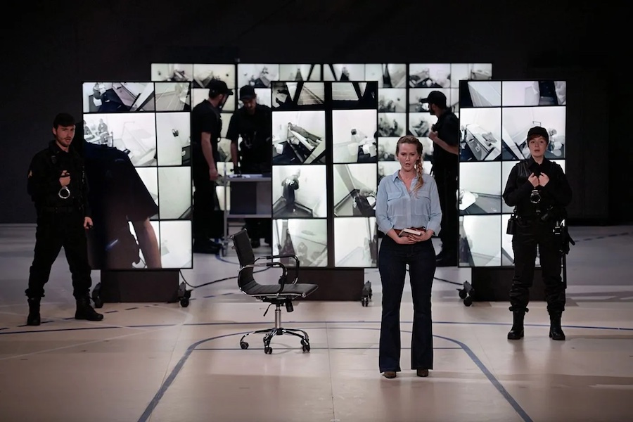 «Sprecht leise, haltet euch zurück, | wir sind belauscht mit Ohr und Blick!» (Parlate piano, frenatevi, orecchi e sguardi ci spiano!) cantano i prigionieri a cui è stata concessa una boccata d’aria. Infatti sul palcoscenico dell’Opéra Comique una parete di monitor permette di controllare i detenuti di una prigione di oggi, potrebbe essere il famigerato carcere di Guantanamo. La tecnologia è cambiata, ma è sempre la stessa la violenza e sono gli stessi i soprusi, con i detenuti privati dei loro averi personali che finiscono in parte nelle tasche dell’avido carceriere Rocco, che d’altronde aveva intonato poco prima la sua prosaica lode al denaro: «Hat man nicht auch Gold beineben, | kann man nicht ganz glücklich sein» (Se non hai dell’oro appresso, non puoi esser davvero felice) ai due giovani innamorati Jaquino e Marzelline, in realtà la ragazza è innamorata di una terza persona…