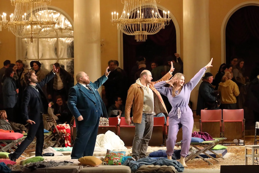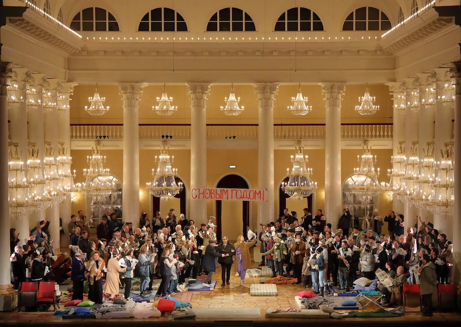 L’impianto scenografico di Černjakov è costituito da un elegante salone, un luogo fortemente iconico per la Russia: la “Sala delle colonne” della Casa dell’Unione – sede di cerimonie ufficiali, funerali, balli, processi, concerti, sfilate di moda… Jurovskij racconta di aver ascoltato qui il padre dirigere la Prima Sinfonia di Prokof’ev! È un ambiente chiuso in cui tutti i personaggi sono vittime di una qualche situazione tragica: non si tratta di rifugiati o di sfollati, bensì di un insieme di persone inserite in un esperimento sociale. Vestiti nei modi più vari, dormono accampati su materassi per terra, lettini da campo, sedie pieghevoli. Dall’esterno si sentono scoppi, sparatorie, grida. In alto uno striscione augura “Buon anno nuovo” ma nella seconda parte, quando i grandi lampadari di cristallo sono coperti da un velo nero, questo viene sostituito da un altro sbilenco e con lettere mancanti su cui si riesce a leggere a malapena “Lunga vita al grande invincibile Stalin…” affiancato da un didascalico “La battaglia di Borodino. Gioco di guerra patriottico”. Si tratta infatti di giochi, di finzione: i balli della prima parte hanno come personaggi gli stessi sfollati che si sono costruiti ventagli e tiare con la carta di giornale e giocano a fare gli aristocratici; la battaglia di Borodino è simulata con armi finte e finte esecuzioni. Ma se le vicende sono ricostruite nella finzione, così non è delle emozioni, che qui hanno la stessa intensità e Černjakov riesce come sempre a gestire in maniera esemplare i personaggi con le loro psicologie così come i movimenti delle masse.