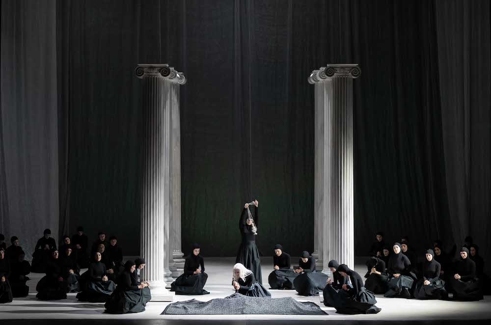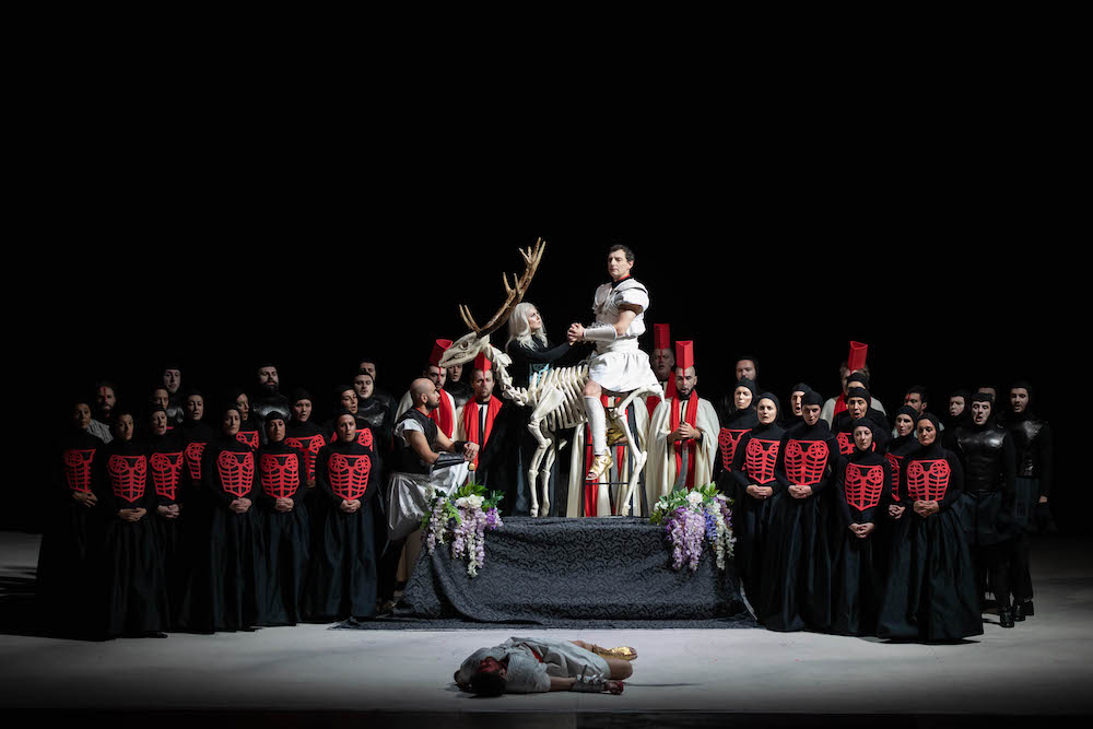 Prestazione magistrale è quella di Corinne Winters che si sobbarca il compito raramente realizzato di interpretare entrambe le Ifigenie, malgrado le due diverse tessiture: più lirica e luminosa quella della prima parte, più grave e introversa quella della seconda. Quasi sempre in scena, il soprano americano non dà cenni di affaticamento con momenti magici come quando intona «Ô malheureuse Iphigénie !» con accento sobrio ma proprio per questo più straziante. «Dieux, auteurs de mes crimes» canta invece Oreste, il personaggio più tormentato, che Florian Sempey interpreta con ampia gamma espressiva che talora nella veemenza del racconto va a scapito dell’intonazione, ma la sua è una presenza sonora e scenica di grande impatto. Stanislas de Barbeyrac è un Pilade stilisticamente impeccabile e nella sua aria «Unis dès la plus tendre enfance» molto commovente. Assieme i due cantanti portano in scena un indimenticabile rapporto di amicizia virile giustamente esaltato dal regista. Alexandre Duhamel è il Thoas distrutto dalla guerra di cui s’è già detto e la prova del baritono francese risulta del tutto convincente. Véronique Gens fu Iphigénie nella produzione Minkowski/Audi del 2011, ora è una Clitennestra magistralmente recitata e dalla massima attenzione alla parola, cantata con timbro sontuoso e perfezione stilistica. Russell Braun è un Agamennone di grande spessore drammatico mentre qualche stanchezza si coglie nel Calchas di Nicolas Cavallier. Vocalmente esuberante nel suo registro di haute-contre è il narcisistico Achille di Alasdair Kent, interpretato con ironia e cantato con sicurezza di acuti. Ottimo il coro del Concert d’Astrée istruito da Richard Wilberforce, quasi onnipresente nella partitura anche se in questa edizione è un personaggio spesso invisibile e relegato in buca.