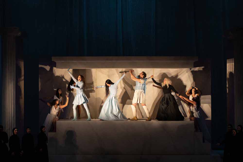 Le numerose danze presenti in partitura vengono rese con movimenti in scena del coro e dei protagonisti principali, come il balletto-pantomima delle Eumenidi con l’apparizione di Clitennestra uccisa più volte da Oreste. Sempre molto attento alla psicologia dei personaggi si dimostra anche questa volta Černjakov. Ad esempio il rapporto bruscamente fisico tra Oreste e Pilade cela una relazione fortemente affettiva che però il regista, gay dichiarato, non rende sentimentalmente esplicita, anche se il libretto ne darebbe l’occasione. La seconda parte en Tauride risulta più convincente di quella en Aulide, ma l’aspetto borghese della vicenda mitologica sembra una soluzione un po’ troppo facile e un po’ scontato l’accento sul dramma di una famiglia così disfunzionale come quella di Agamennone – e qui Elettra è ancora una bambina mite e inoffensiva!