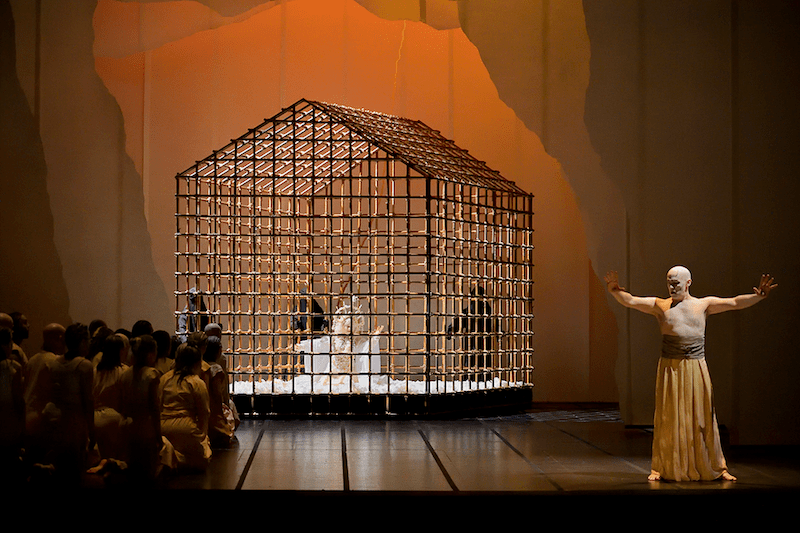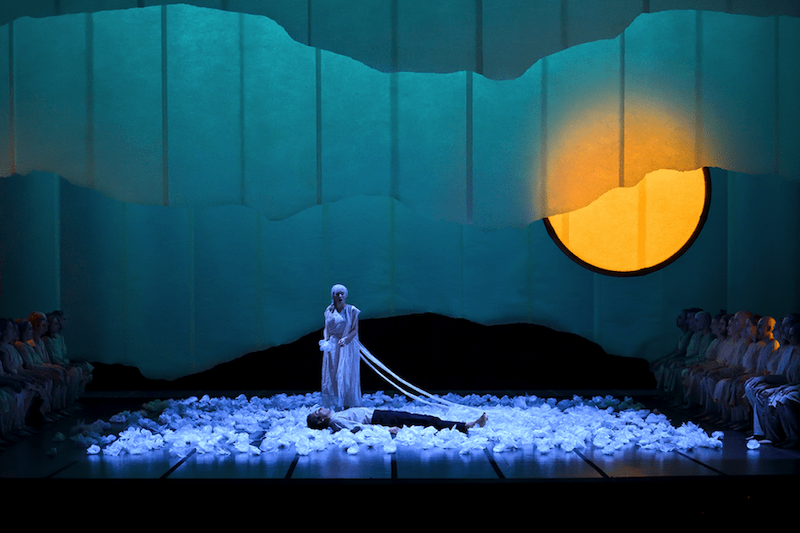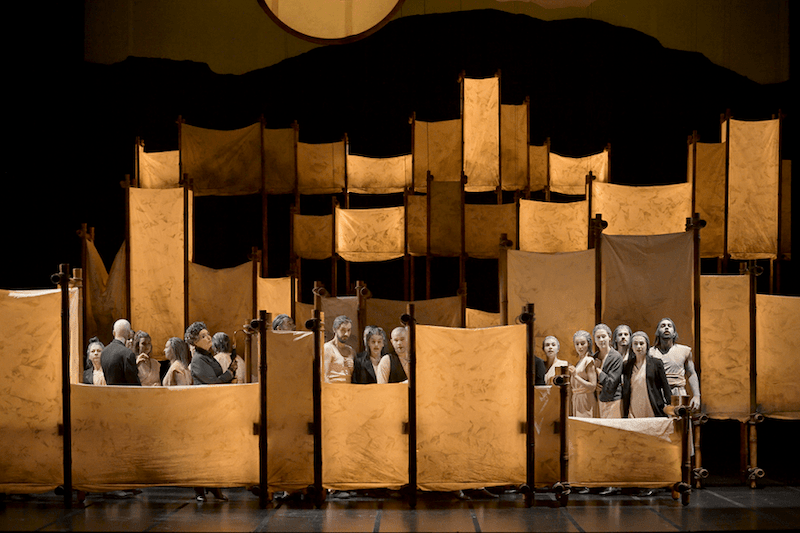 Dei vari piani su cui si sviluppa la messa in scena di Bernard si apprezza la coerenza drammaturgica tra il film, che vediamo in ampi spezzoni, e quanto viene agito dal vivo nella scena divisa in due, con le sapide ma non distraenti controscene, come le reazioni dei magistrati in alto nei loro scranni a quanto viene “rivissuto”, come flashback della protagonista, nella parte bassa. Rispetto all’analoga opera di Puccini, qui il Settecento è meno ingombrante e infatti al regista riesce molto meglio la trasposizione in tempi moderni, come se Massenet ne rendesse più facile l’attualizzazione. Merito è certamente dei librettisti francesi che hanno lavorato con più serenità al testo ricavato da Prévost di quanto sia successo invece per l’affannato iter di quello italiano affidato a un numero inverosimile di mani.