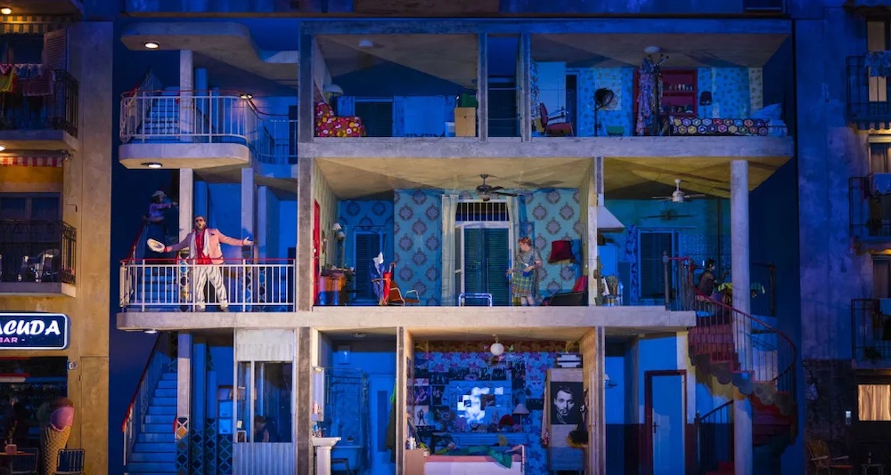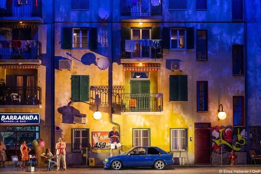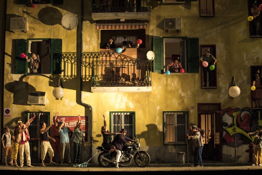 Un sipario dipinto a drappi rossi bordati d’oro separa e mostra in trasparenza i diversi quadri dell’opera. Le scenografie vagamente strehleriane nelle dimensioni e nei colori sono illuminate dalle belle luci di Eduardo Bravo mentre particolarmente riuscito è l’allestimento del terzo atto, con il salone scandito da archi e colonne, e del patio del finale, ricco di vasi, piante, fiori e una fontana. Un suggestivo panorama notturno su cui si alza una grande luna piena. Attento è il gioco registico, ma sempre sobrio e affidato alle competenze attoriali degli interpreti.