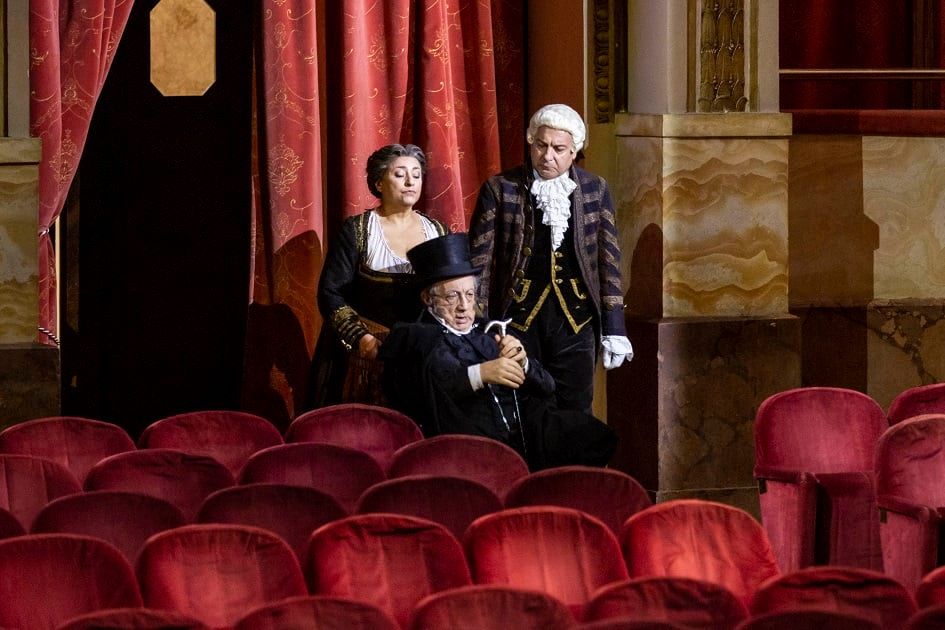 Un sipario dipinto a drappi rossi bordati d’oro separa e mostra in trasparenza i diversi quadri dell’opera. Le scenografie vagamente strehleriane nelle dimensioni e nei colori sono illuminate dalle belle luci di Eduardo Bravo mentre particolarmente riuscito è l’allestimento del terzo atto, con il salone scandito da archi e colonne, e del patio del finale, ricco di vasi, piante, fiori e una fontana. Un suggestivo panorama notturno su cui si alza una grande luna piena. Attento è il gioco registico, ma sempre sobrio e affidato alle competenze attoriali degli interpreti.