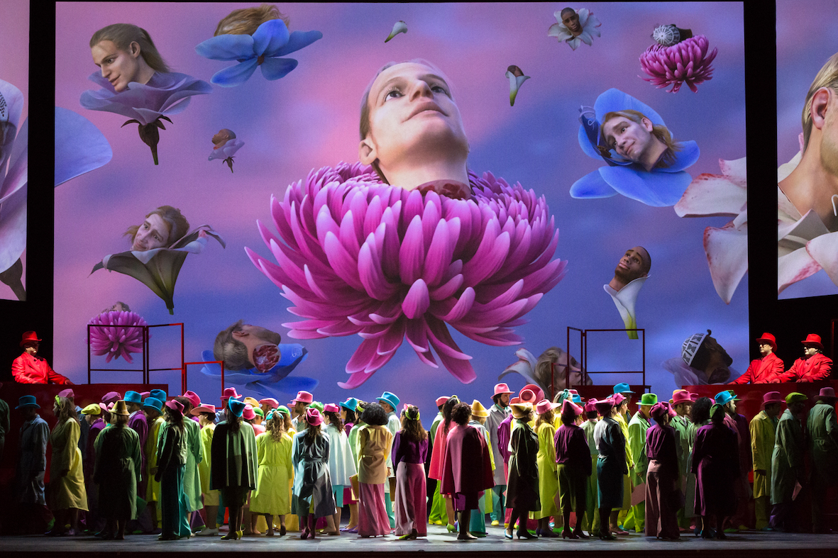 La gelida principessa è vestita come una minacciosa crisalide bianca, in cinese il colore della morte; Timur e Liù si presentano come profughi stracciati, Calaf porta un grande rospo sulla schiena (spero che a quest’ora qualcuno ne avrà scoperto il significato e lo possa finalmente comunicare). Elementi vagamente fantascientifici si mescolano ad altri tradizionali cinesi, come le maschere orripilanti delle guardie di Liù o le lanterne bianche con forme zoomorfe o strane come i copricapi di Ping (una bomba), Pang (due mani che fanno il dito medio) e Pong (due telecamere). Lo stesso dito medio è mostrato da un gruppo di giovani al canto di «Gloria a te» rivolto al vecchio imperatore. Vedremo lo stesso gruppo mimare il cammino verso un orizzonte si spera più radioso nel finale, qui senza apoteosi amorosa.