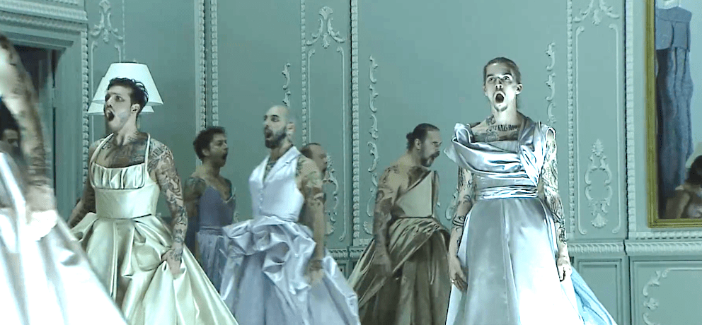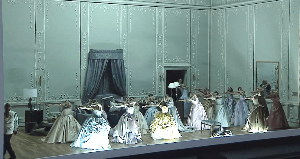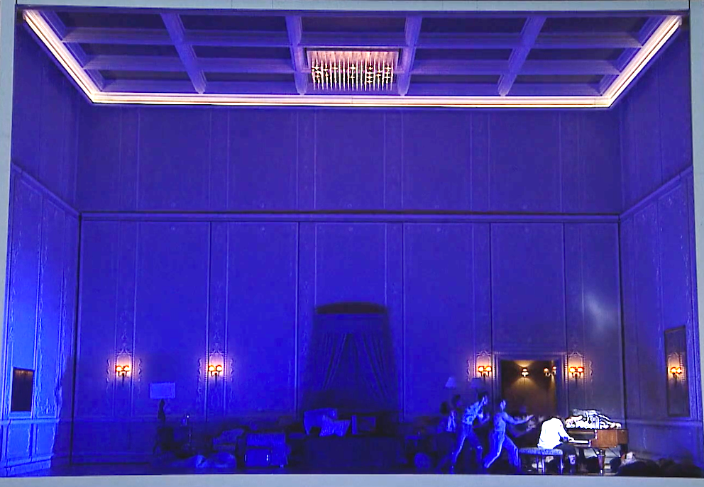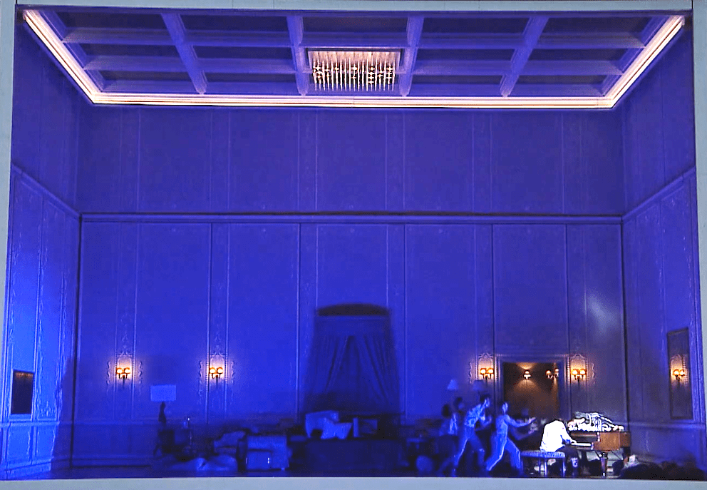 Dal secondo atto siamo in un ambiente non molto diverso, con le insegne al neon che dominano oltre la vetrata. Nella scena del mago Agrippa tutto si trasforma in una scenografia multipla (di Boris Kudlička) che divide lo spazio del palcoscenico del Grand Théâtre de Provence in più ambienti. Qui l’atmosfera richiama i film di David Lynch con i personaggi che si sdoppiano o triplicano come in un incubo angoscioso. Ancora una volta l’immaginario cinematografico presta le sue illusioni al teatro lirico e un regista inquieto come il direttore dell’Opera di Varsavia adatta la sua visionarietà a una delle opere più enigmatiche del secolo trascorso.