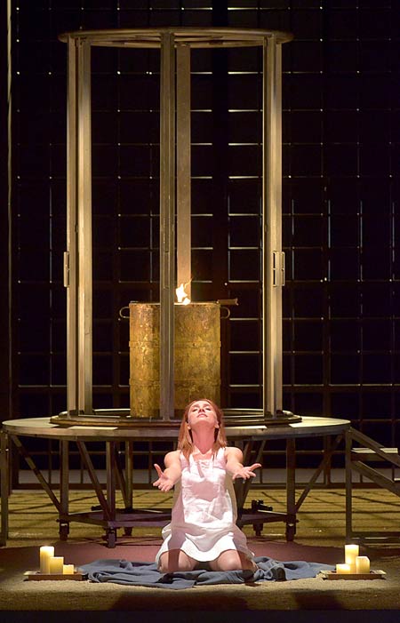 Nel mondo ideato dalla Steier il culto mariano affianca il culto della personalità del potente. Con la scenografia di Étienne Pluss il tempio di Vesta richiama il grande anfiteatro della Sorbona, simbolo della cultura e dell’erudizione ma in stato di abbandono e dove si eseguono torture e il fuoco è alimentato dai libri. Durante l’ouverture su una parete scorrevole si vedono dei corpi sanguinolenti appesi per i piedi e la scena del trionfo è sostituita da un autodafé della Santa Inquisizione con carri di scorticati e donne in gabbia. Prima avevamo assistito alla fustigazione di Giulia da parte della Grande Vestale in uniforme nazista (costumi di Katharine Schlips). Sul fondo la scritta latina “Talis est ordo Deorum” sarà rimpiazzata alla fine dalla frase di Voltaire «Le fanatisme est un monstre qui ose se dire le fils de la religion».