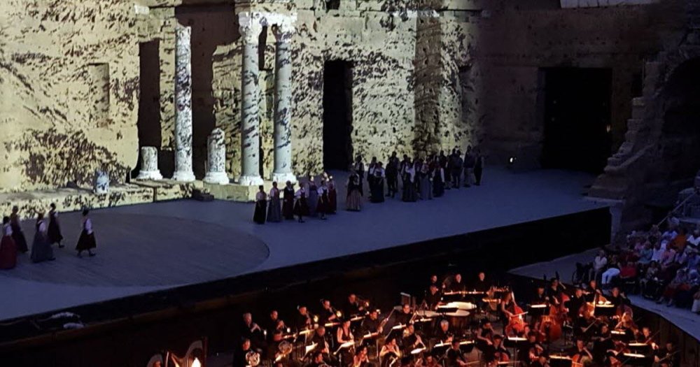 Alle Chorégies d’Orange il direttore della manifestazione, Jean-Louis Grinda, ha programmato quest’anno, a 190 anni dal suo debutto parigino, l’impegnativo ultimo capolavoro di Rossini. Impegnativo per voci, orchestra e messa in scena. Per quest’ultima Grinda, nelle vesti di regista, ha giocato al risparmio sia per idee registiche che sceniche: non si sa se per problemi di budget (una sola serata) o per stringenti costrizioni all’utilizzo della particolare location del Théâtre Antique o per una voluta scelta registica, fatto sta che l’apparato scenografico è limitato a sole proiezioni, efficaci ma non esaltanti, sul muro di scena colonizzato da rondini che hanno accompagnato coi loro garriti le note della sinfonia. Ecco quindi un gioco d’ombre per la «sombre forêt», le increspature delle acque prima placide e poi turbolente del lago dei Quattro Cantoni e infine il paesaggio di montagna, un «horizon» non proprio «immense», del più bel finale d’opera di tutti i tempi. All’inizio era comparsa una carta della Svizzera e per la scena di Gesler al terzo atto un muro di castello coi suoi stemmi. Tutto realizzato in videografica. Unici elementi tangibili sono la strana barca con cui arrivano Rodolphe e i soldati alla fine del primo atto e la striscia di terra arata da Tell nel cui solco alla fine una bambina getterà dei semi – i semi della libertà. Quest’ultima è pressoché l’unica idea di una produzione che si affida a una tradizione delle più consolidate: mela (enorme) e balestra comprese e pure il cavallo su cui entra in scena Hedwige. Una piattaforma rotante e leggermente basculante è utilizzata con una tale parsimonia che alla fine risulta quasi inutile. C’è chi ha definito quella di Grinda una mise en place più che una mise en scène…