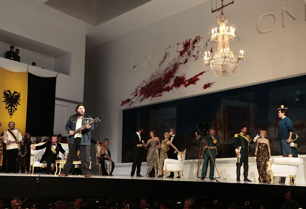 I personaggi passano da un ambiente all’altro, da quello dei capitalisti occidentali (l’Egitto di Faraone del libretto) a quello dei rifugiati (gli ebrei nell’attesa sempre delusa di partire per la Terra Promessa) nei primi due atti. Poi nel terzo la scena viene unificata e la parte sinistra diventa il palcoscenico per il balletto, un’efficace coreografia di Jeroen Verbruggen, con il pubblico degli invitati destra. Su uno schermo vengono proiettate immagini di catastrofi naturali per illustrare le piaghe mandate dal dio di Mosè agli egiziani. Nel finale, su una grande tela vediamo il Mar Rosso dividersi con gli egiziani (ossia noi occidentali con i completi scuri, le scarpe a spillo, i tailleurs…) sommersi da quelle acque vendicatrici – il rimando alle immagini dei migranti che fanno la stessa fine nel mar Mediterraneo non è certo casuale. Poi la tela si alza un’ultima volta per rivelare una spiaggia con bagnanti pigramente allungati sulle sedie a sdraio, occhiali da sole, un cocktail in mano o il telefonino. Gli ebrei sono nel frattempo scesi con i loro gilet arancioni tra gli spettatori della platea, ma sulla scena una delle bagnanti scopre sulla sabbia il bastone di Mosè che prima guarda con curiosità, poi getta con orrore, come se avesse percepito qualcosa di strano. Non c’è traccia di soprannaturale nella lettura di Kratzer: gli interventi divini sono le calamità che ci stiamo costruendo noi stessi: siccità, incendi, alluvioni, carestie, guerre sono il frutto della nostra incosciente azione sul pianeta che ci ospita. Così, anche le tenebre (prima piaga del libretto, quinta della narrazione biblica) sono causate da un black out dell’energia elettrica.