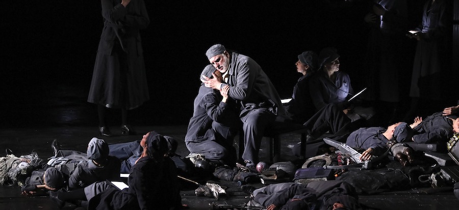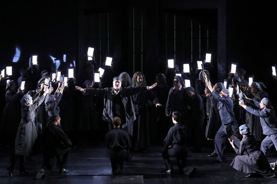 Sempre presenti sono gli sgherri di Gesner con stampato in volto per tutte e cinque le ore un ghigno satanico mentre violentano, torturano e uccidono senza pietà – e senza senso del ridicolo. Nei costumi di Ursula Patzak medioevo, Ottocento e contemporaneità si mescolano allegramente – armature e mitragliatrici, cappottoni e balestre – mentre le scene di Alessandro Camera definiscono un mondo carcerario e oppresso immerso nel buio che potrebbe andare bene per il Fidelio o il Wozzeck: tutto è nero e grigio, la natura, tanto evocata nel libretto e nella musica, è del tutto assente e appare solo nel finale in forma di brutte cascate dipinte. Unico momento di apertura, ma ahimè un filino patetico, il cielo stellato durante l’aria di Mathilde. I ballabili sono resi coerentemente con le apprezzabili coreografie di Silvia Giordano che ricordano quelle della produzione di Vick del 2013 e poi di Michieletto nel 2015, quindi niente abiti tirolesi piroettanti o, peggio, pas de deux sulle punte, ma movimenti convulsi e violenti.