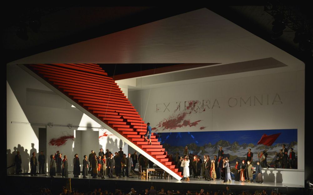 Nel 1897 Ferdinand Hodler aveva dipinto l’eroica figura di Wilhelm Tell, ora al Museo d’Arte di Solothurn che possiede altre opere del pittore svizzero. Per la sua messa in scenaa Losanna il regista Bruno Ravella utilizza un paesaggio di Hodler – uno dei tanti in cui le montagne si riflettono sulla superficie di un lago – uno dei pochi elementi figurativi nella sua sobria lettura dell’ultimo capolavoro di Rossini, lasciando alla supremazia della meravigliosa musica tutto il suo spazio. Musica ascoltata per la prima volta nella città sul lago Lemano grazie al nuovo direttore del teatro, il marsiglese Claude Cortese, che inaugura la stagione e il suo incarico con questo grande successo.