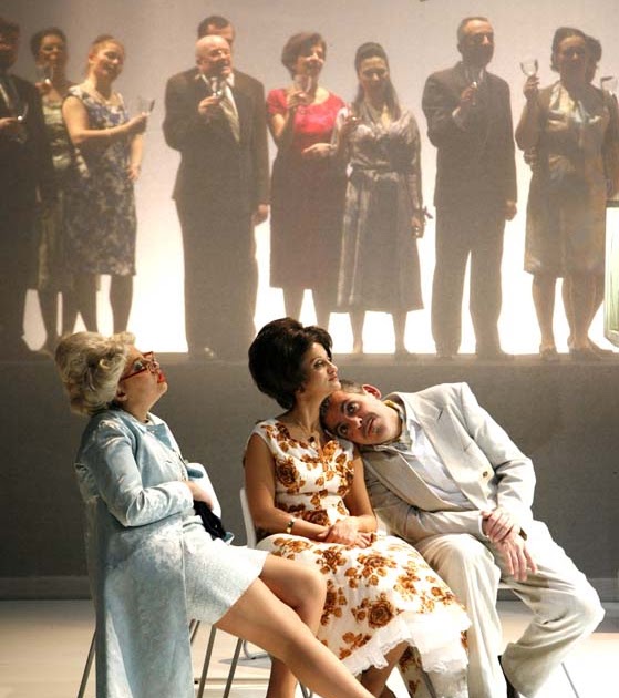 La messa in scena di Stefania Bonfadelli unisce, non solo scenograficamente, i due atti unici: le situazioni sono in qualche modo speculari, i personaggi dell’una li ritroviamo nell’altra. La comicità non è ottenuta con la facile caricatura dei personaggi, ma con il preciso incastro delle situazioni nel parallelismo dei due matrimoni. La funzionale e visivamente pregevole scenografia di Serena Rocco affianca la farmacia di Annibale Pistacchio (Il campanello) alla locanda a tre stelle di Séraphine (Deux hommes et une femme). I coloratissimi costumi anni ’60 di Valeria Donata Bettella e le luci di Fiammetta Baldiserri ricreano un mondo gustosamente caratterizzato da pellicola del boom italiano in cui si calano con divertita partecipazione i personaggi e i coristi. Tutti sfoggiano una recitazione spontanea e fluida con divertenti gag e controscene.