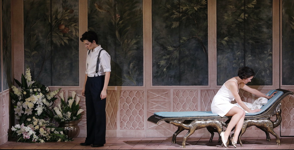 Che sono comunque Lisette Oropesa e Marianne Crebassa, due tra le più acclamate cantanti della scena internazionale. La prima debutta in un ruolo belliniano che è comunque nel solco delle scelte belcantistiche del soprano americano, il quale sfoggia una linea di canto purissima, timbro incantevole, mezze voci e legati perfetti e un’emissione omogenea nel passaggio nei vari registri, con acuti affrontati con agio e gravi sonori. Il personaggio viene così magnificamente caratterizzato nella sua dimensione tragica di contrasto tra l’amore/dovere verso il padre e quello romantico/sensuale per il giovane della casata nemica. Gloriosamente delineato è anche il Romeo della Crebassa, che impegna la sua apprezzata vocalità per esprimere un ruolo che Bellini ha considerato il più impegnativo dell’opera, affidandolo appunto alla diva indiscussa dell’epoca, Giuditta Grisi. Dalla marziale cabaletta del primo atto, all’addio finale è tutto un gioco di slanci ed esitazioni reso con grande sensibilità dal mezzosoprano francese. Autorevole come sempre e perfettamente immerso nella parte è Michele Pertusi, il confidente di Giulietta. La recitazione è un tutt’uno con l’espressione musicale e ci si rammarica che Bellini gli abbia concesso una parte così vocalmente ridotta. Ottima prova la fornisce Jinxu Xiahou (Tebaldo) sia per quanto riguarda la vocalità vera e propria sia per la dizione, che è talvolta un problema per i cantanti cinesi. Timbro e fraseggio sono del tutto convincenti, fiati e acuti perfettamente realizzati e il personaggio intrinsecamente antipatico del duplice avversario – in politica e in amore – risulta invece piacevolmente efficace. Cavernosa e anche povera di armonici, la voce di Jongmin Park non riscatta la parte del cattivo, Capellio, il responsabile insensibile di tanto dolore.