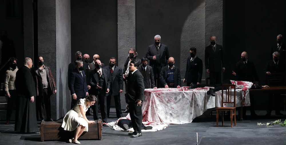 Una tortura per i coristi, le mascherine non hanno permesso di apprezzare appieno la prova del coro istruito da Alberto Malazzi: le voci escono soffocate, le parole poco distinte, i colori smorzati. Diamo loro il credito che meritano e aspettiamo che presto possano esprimersi senza la museruola – rossa per i Montecchi, nera per i Capuleti, come ha voluto il regista Adrian Noble.