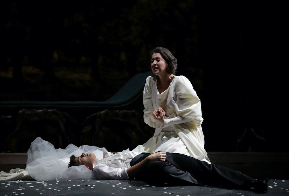 Il grigiore delle mura e dei torrioni si apre talora ad ambienti più intimi e colorati, ma non meno claustrofobici, come la camera di Giulietta che avanza dal fondo con le sue finestre sul verde e la curiosa chaise longue zoomorfa. La stessa fungerà da catafalco per il suo “cadavere”. Contrariamente a ogni logica il registra sceglie di ambientare l’ultima scena en plein air: invece del soffocante ambiente delle tombe degli avi – e del recentemente morto fratello – che Giulietta paventa, qui siamo sotto le fronde di alberi fioriti. Una scelta che ha concluso una lettura registica sostanzialmente anonima ma che per una volta ha messo d’accordo gli spettatori della platea con quelli del loggione e non ci sono state contestazioni rivolte al metteur en scéne, che ha invece condiviso gli applausi del pubblico. Applausi che sono diventati ovazioni fragorose per le donne dello spettacolo: Lisette Oropesa, Marianne Crebassa e Speranza Scappucci. Un vero trionfo al femminile.