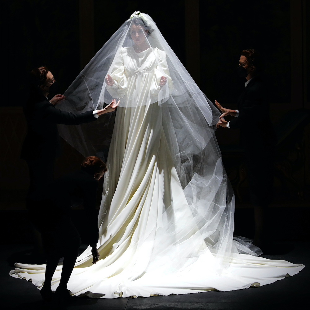 La storia si dipana con chiarezza: a metà della sinfonia vediamo la scena in cui viene accidentalmente ucciso il fratello di Giulietta, il cui “fantasma” ritornerà più volte a calcare la scena – una trovata questa del tutto inutile nell’economia della rappresentazione. Le scene d’azione sono abilmente realizzate grazie anche alla presenza di un maestro d’armi, Mauro Plebani. La scenografa Joanne Pearce cura i movimenti di “danza” dei camerieri con le loro torreggianti torte nuziali, una scena ironica che introduce un cambio di registro inaspettato dopo la violenza a cui abbiamo assistito, compreso il lancio di una bomba molotov alla fine del primo atto. Forte è anche il contrasto tra la scena dei poveri che cercano un po’ di calore sotto la neve cacciati dai Capuleti, che nel frattempo rapiscono Lorenzo, e il funerale di Giulietta, che sembra uscito da un quadro preraffaellita.